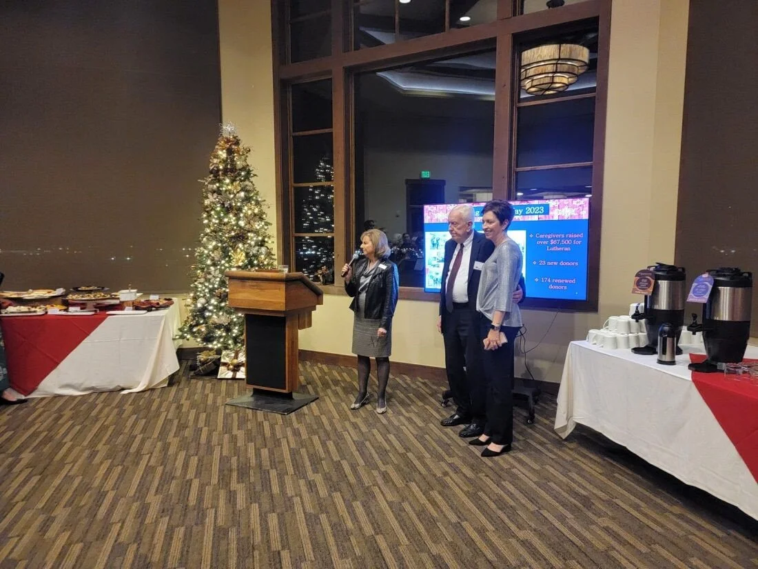 Kathie Repola, executive director of the Lutheran Foundation, announced a $1M gift from Ritzman, with his daughter, Michelle Spidell, at the Foundation’s annual Holiday Gratitude celebration.