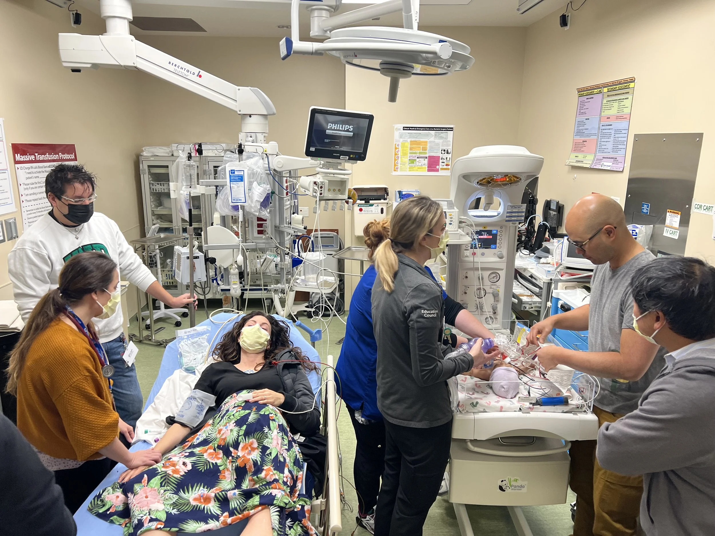 The SIM: Pre-term delivery in the parking lot. "Mom" showed up in active labor, and the team needed to deliver the neonate outside. Neither breathing nor responsive after delivery, the team had to begin neonatal resuscitation. Mom then had a pre-eclamptic seizure. Reviewed: Delivery protocols outside the hospital, caring for two patients at once, neonatal resuscitation (NRP) and maternal post-delivery complications. Worked in collaboration with NICU and Ob/Gyn educators.