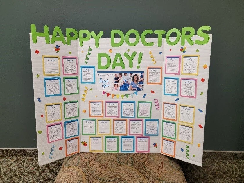 A recognition poster filled with the thank-you notes included with the gifts was displayed in the Physician Lounge to celebrate and thank all the physicians who were honored by patients.