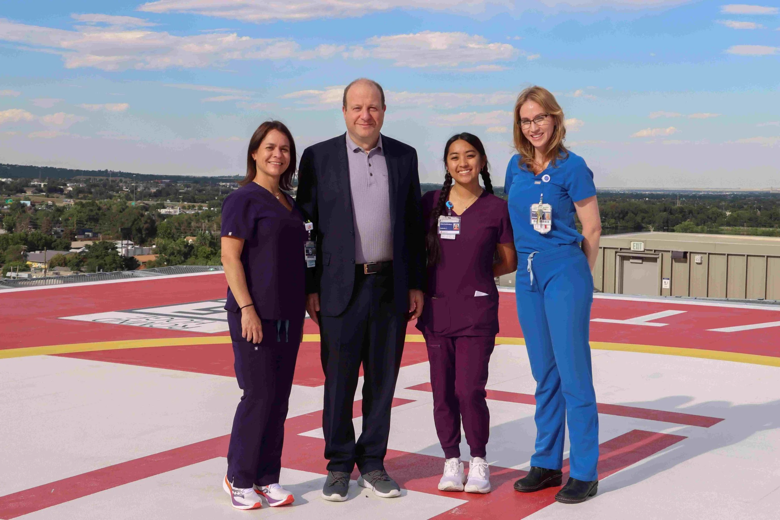 Lutheran’s own Maria Rodriguez, Isabelle Lee and Bridget Raley, RN, posed on the helipad with Governor Jared Polis during his recent visit to our campus to celebrate our Pathfinders Program—a workforce innovation initiative designed to address staffing shortages in healthcare and expand access to meaningful, living-wage careers.