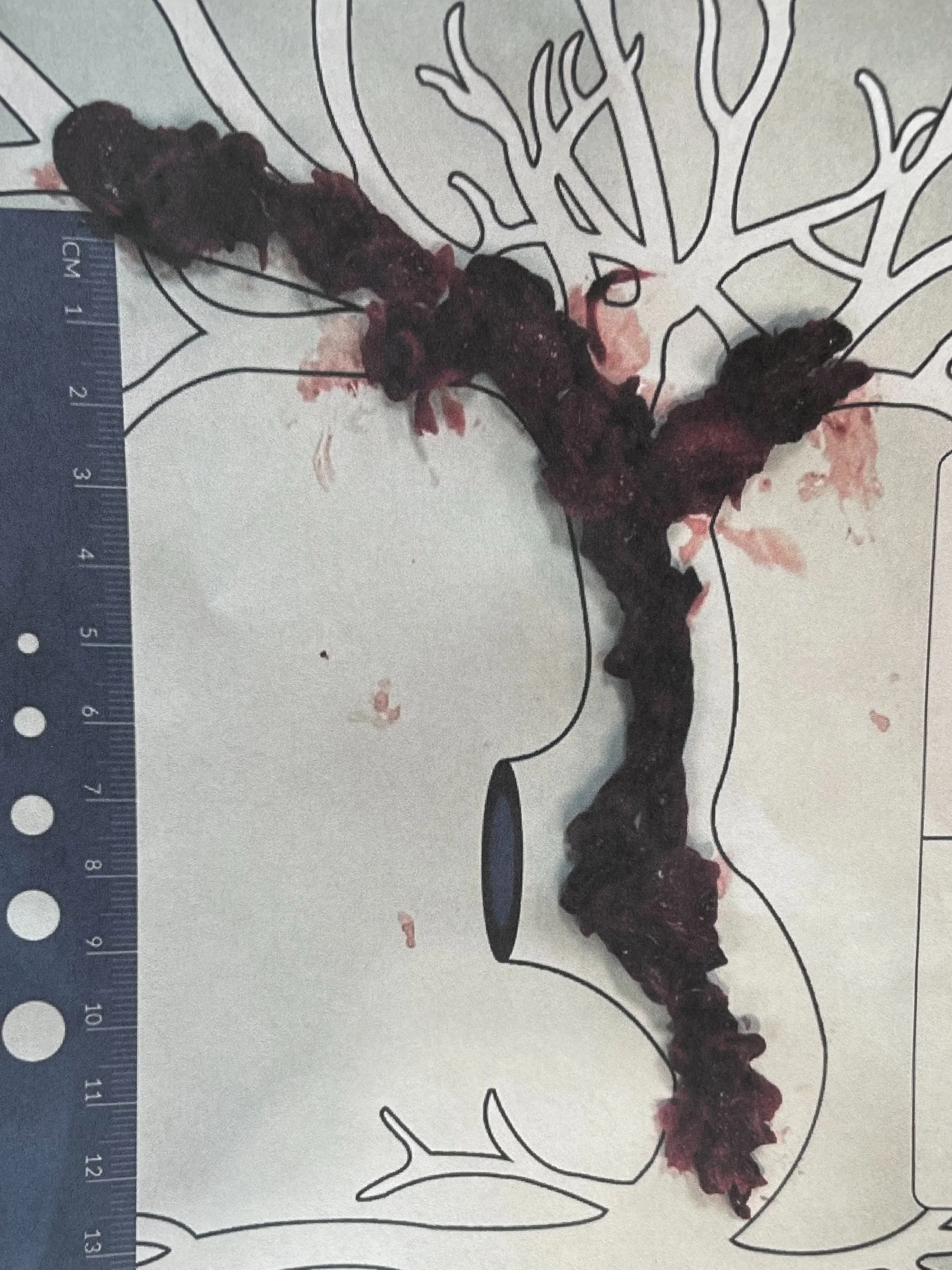 A 75-year-old woman presented to the Emergency Department with a complaint of shortness of breath and chest pain. She underwent a CT, which demonstrated a saddle embolus, as well as evidence of right heart strain. The PERT team was activated, and a treatment plan established that included anticoagulation and intervention. The next morning, yesterday, she underwent thrombectomy with successful extraction of the clot.