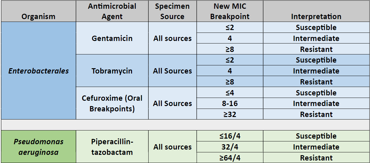 *Note regarding 2023 CLSI breakpoints not being updated: Due to testing limitations on our Phoenix Susceptibility Panel, we will not be able to update the breakpoints for Amikacin for Enterobacterales and Tobramycin for Pseudomonas aeruginosa at this time. The new breakpoints for these two drug/organism combos are listed below for your reference. For any questions regarding the use of these agents, please contact your local ID Pharmacist or Infectious Disease Provider.